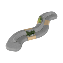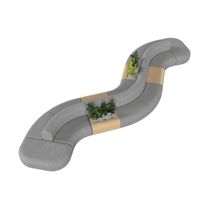 - Modular curved lounge with integrated side tables and planter box.
