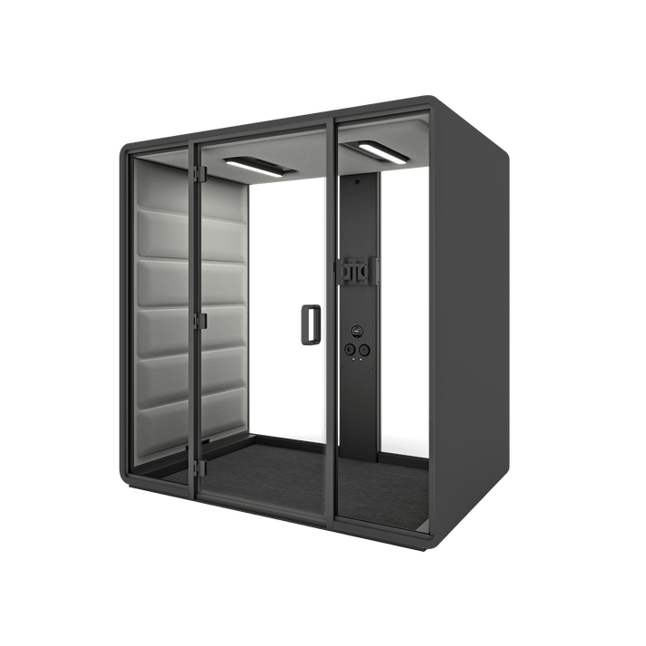 The pod features acoustic glass walls and acoustic panels that help reduce noise transfer in shared environments. Motion activated ceiling lighting provides adjustable brightness for visual comfort during different tasks. Ventilation is delivered through four fans that activate automatically to refresh the interior air during use. An optional control module allows users to adjust airflow, lighting intensity, and colour temperature. Optional accessories such as a TV mounting kit can support hybrid meetings or presentations when required.