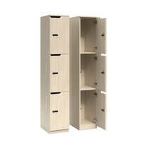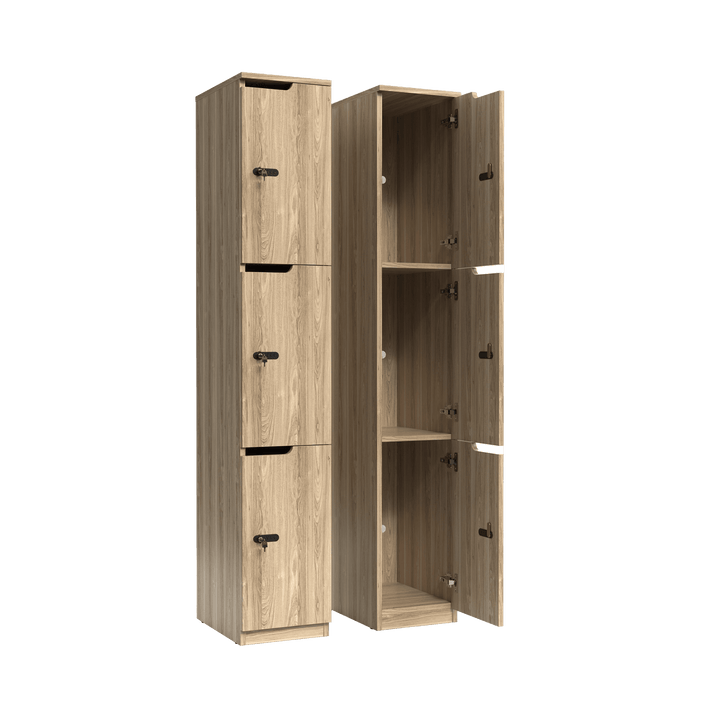 - Features a three-door vertical configuration for separate individual storage.
