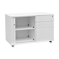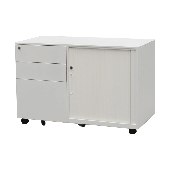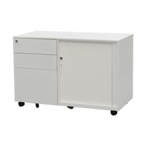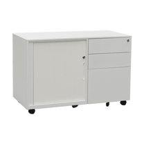 Crafted with robust materials, this caddy features a sleek, hard-wearing powder coat finish. It offers durability and enhances your workspace's aesthetic. The practical design includes two personal drawers and one file drawer. This caters to various organisational needs. The tambour door storage maximises space, allowing efficient use in busy areas.