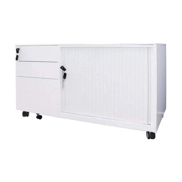 The Rapidline Mobile Caddy provides secure personal storage at workstations, ideal for both dedicated desks and hot desking environments. Featuring a lockable mobile pedestal and tambour door with shelf, it offers organised storage with a compact footprint. With left and right-hand options and smooth mobility, it fits seamlessly into flexible office layouts. Built tough with a 10-year warranty, it's a smart solution for modern storage needs.